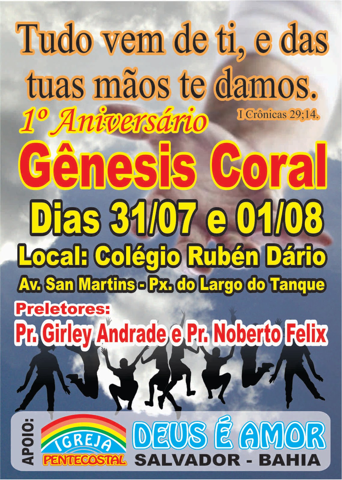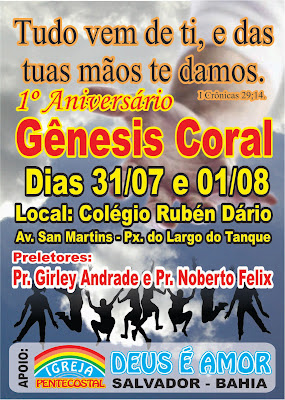 Anote na sua agenda e não deixe de estar louvando a Deus na bela celebração do 1° aniversário do Gênesis Coral! É o convite de nosso mano Leandro e do grupo mais afinado da IPDA de Salvador:
